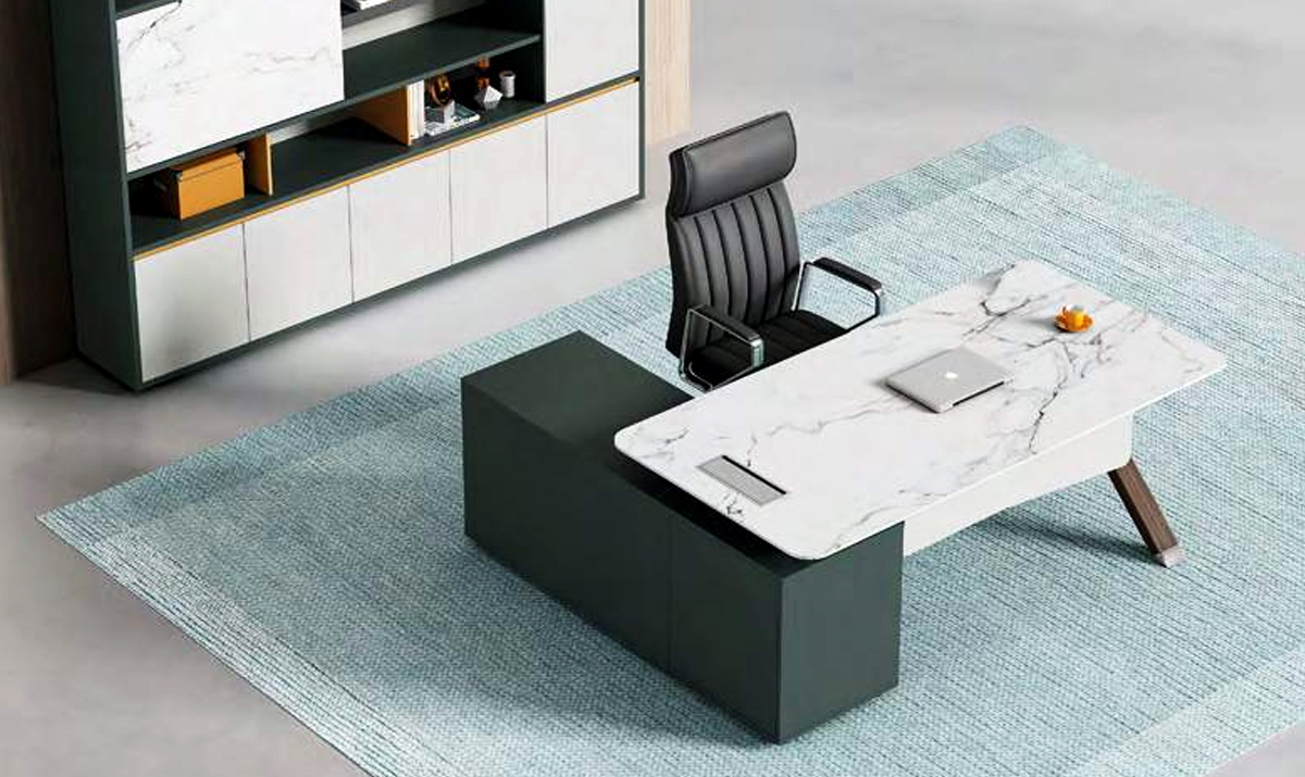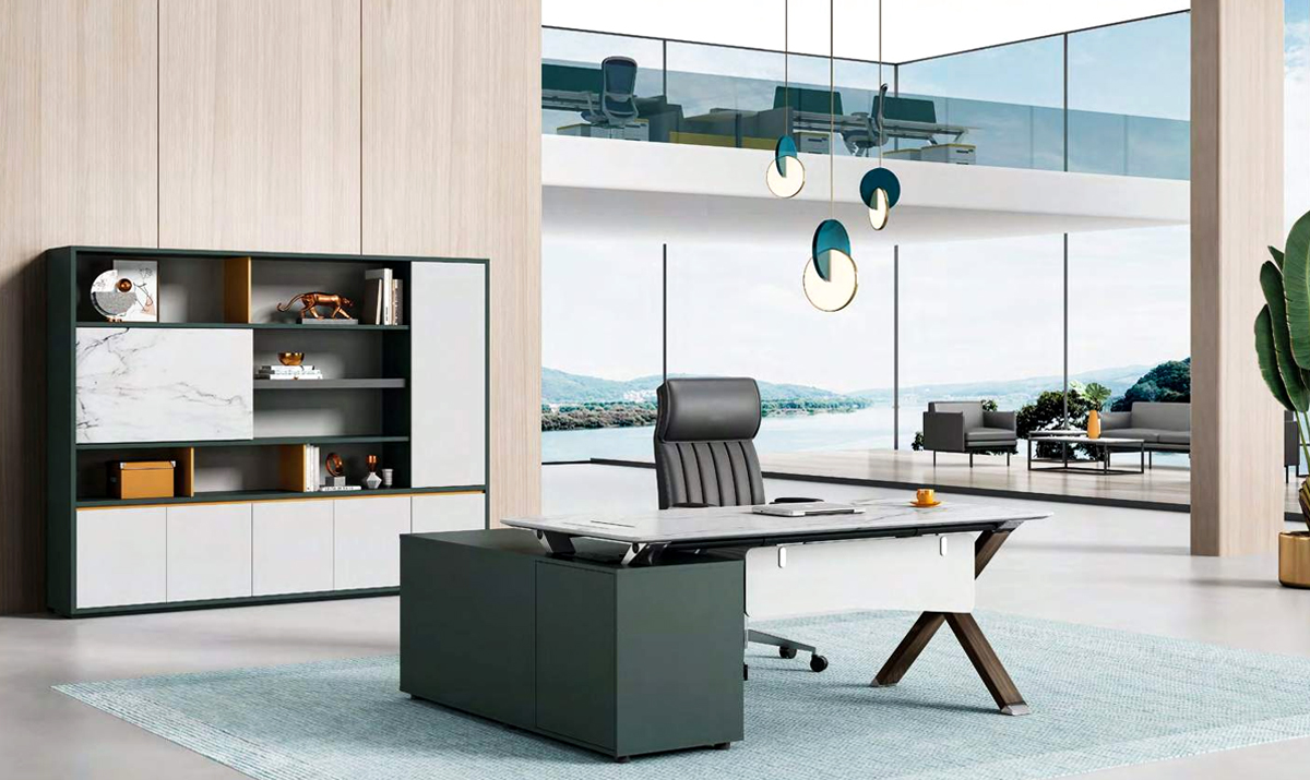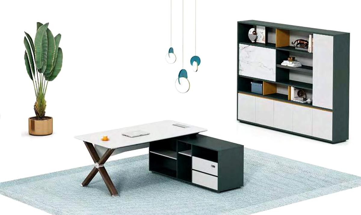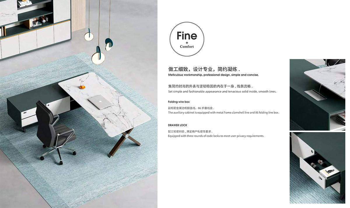 整个行政桌台面板悬空在附台脚上,外观逐层递进挡板造型与台面造型前后呼应,为安博(中国)外观形象添加独特的色彩,