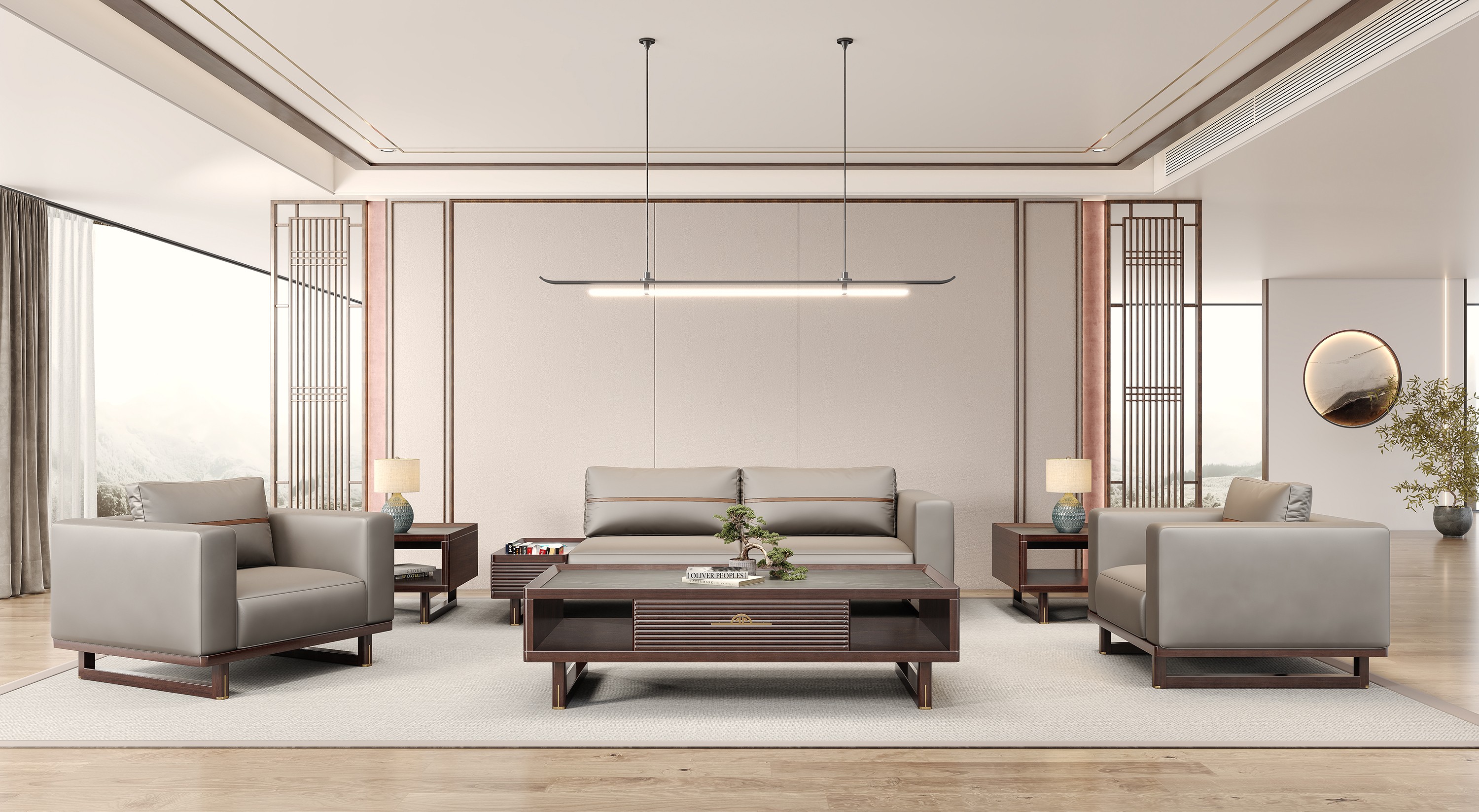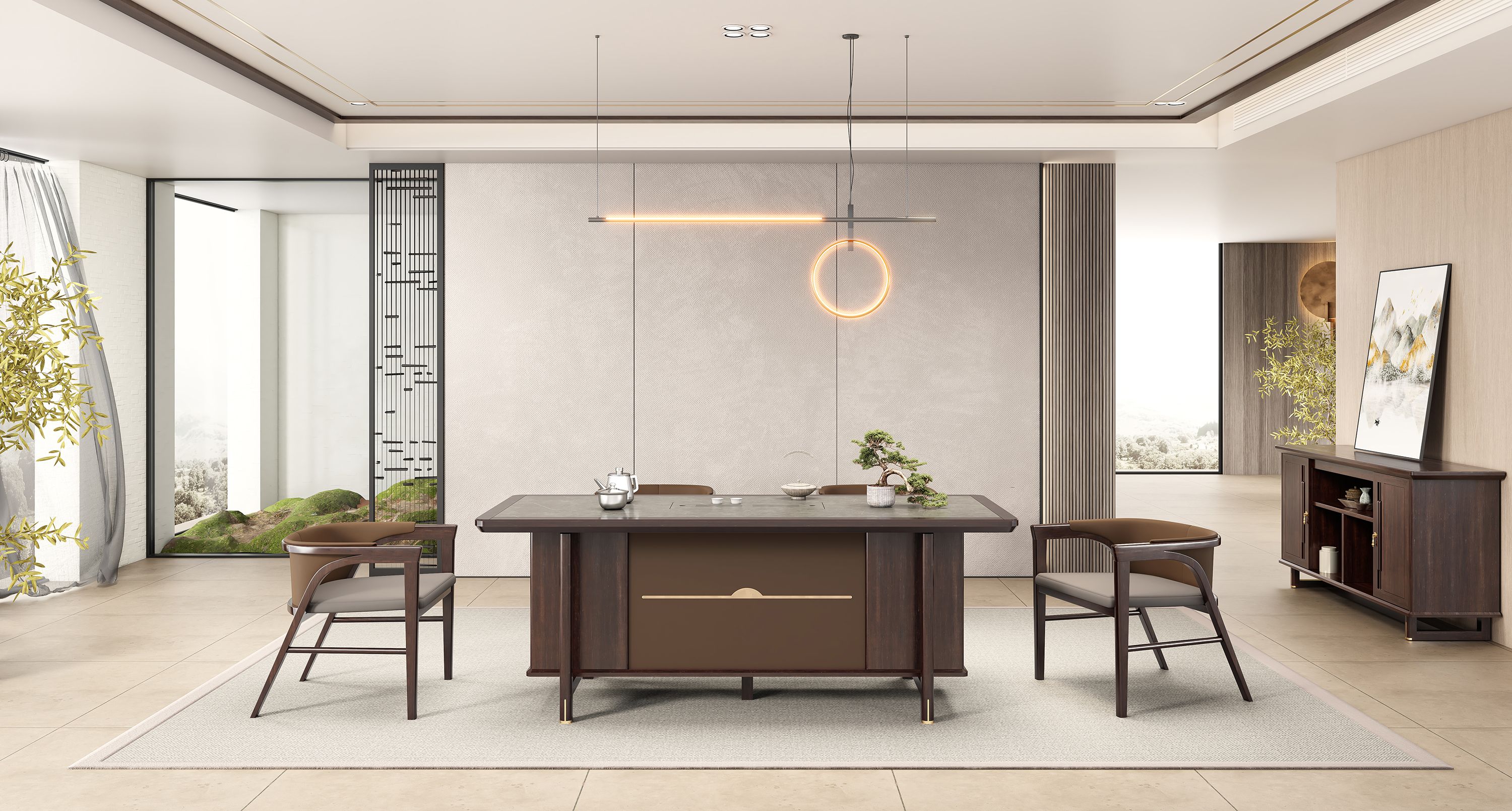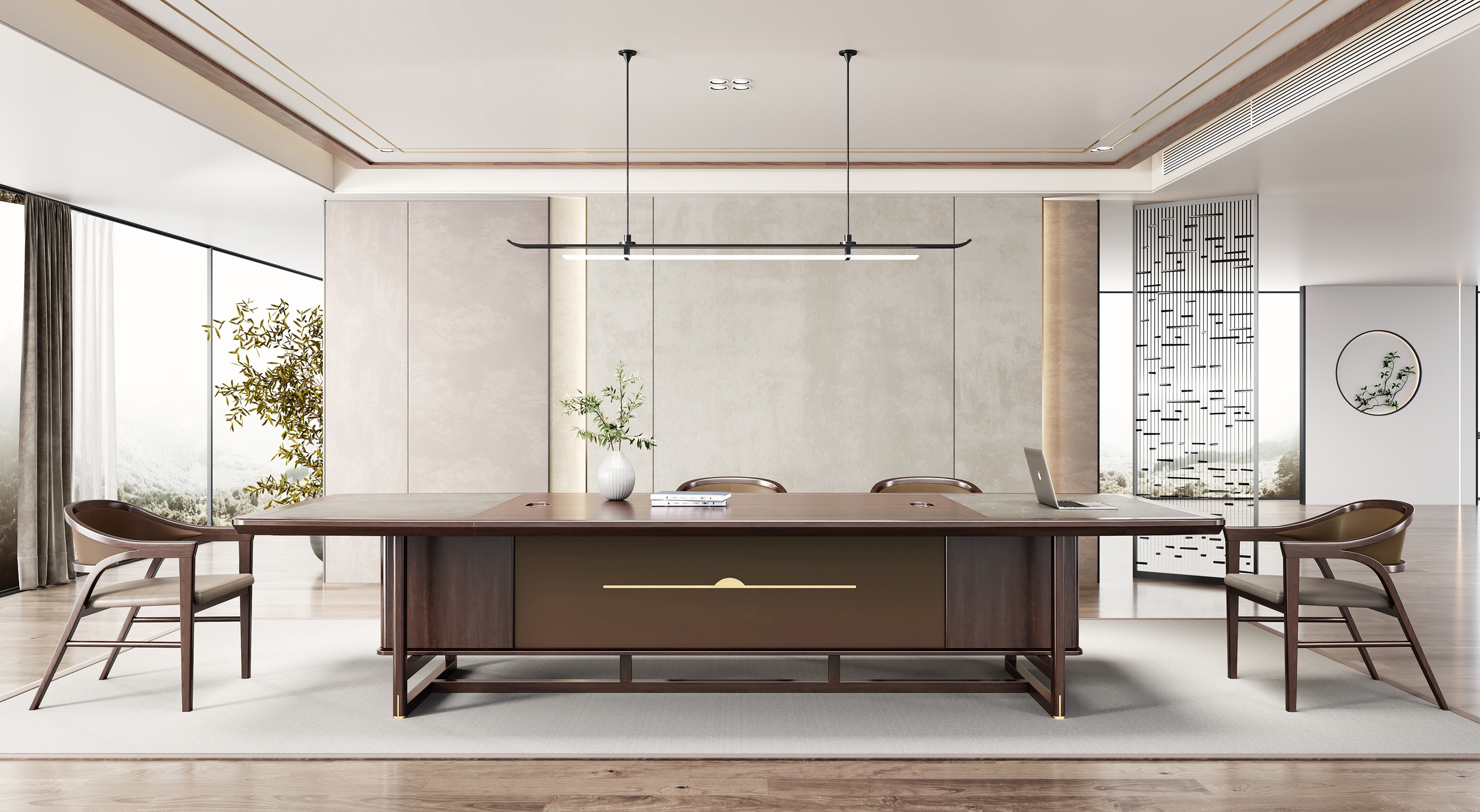 鸿泰系列是一款新中式风格的总裁办公安博(中国),设计灵感源于中式传统装饰纹样“回”字形,因其形式回环反复,延绵不断,有吉利长久的吉祥寓意在造型上主要采用硬朗简洁的直线条,温洞的乌金木与质朴的岩板相结合刚柔并济,时尚大方,既有中式安博·体育古典质朴的内涵显现